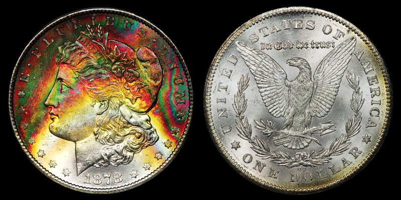 We named it the wave because of the waviness of the electric colors. About 60% of the obverse is covered by rich electric waves of amber/baby blue/violet/burgundy/pearl green and more! Your eyes WILL pop out and roll after seeing this. CC’s seem to be one of the hardest coins to find with real killer colors like this. The ONLY toned 78CC’s we have ever seen that were better-the triplets Brian had called: “batteries not needed”. Those are now a part of the Sunnywood Collection.
