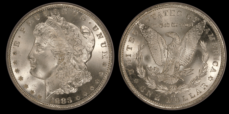 At first glance, this coin looks more like a commoner 83O. All of the surface area is smooth and VERY clean. Any ticks are teenie and are really only visible with a strong glass. The luster is intense and really shows off the bright white color. This is NOT a dipped out coin! Miss Liberty and the details are exceptionally struck and have light frost. Her cheek is amazingly clean and rounded. Any old time perfectionist dollar buyer WILL love this GEM!!!!