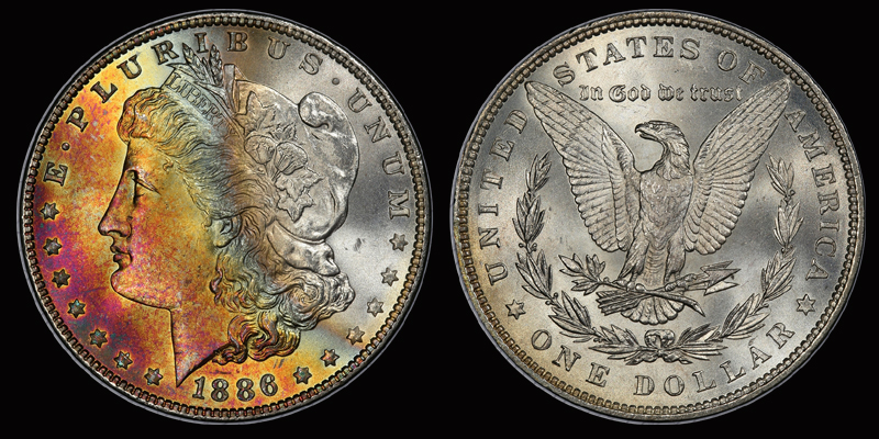 Over 65% of the obverse is covered by a monster electric rainbow. The colors include neon like reds/violets/amber/golds/baby blue. We grade the colors MS68!
