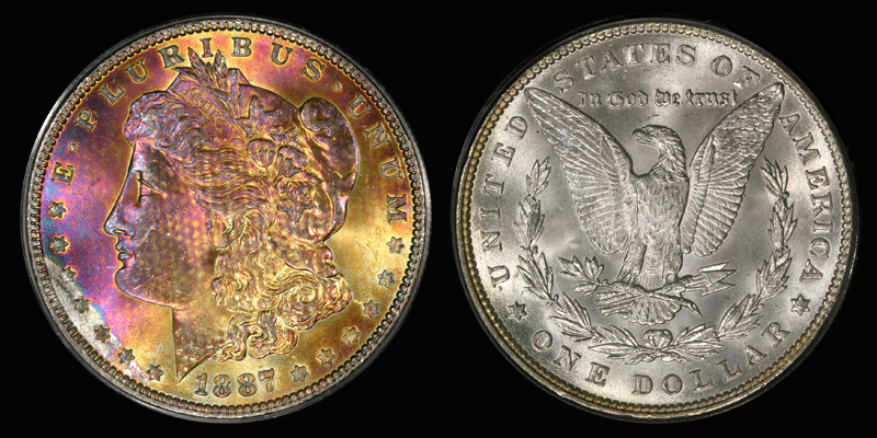 Semi neon like colors are satiny and glow. The shades are violet/red/gold/amber w/hints of blue by the left rim. A full booming luster adds the colors and makes the dots stand out. We grade the colors MS67.5. The colors only cover the obverse.