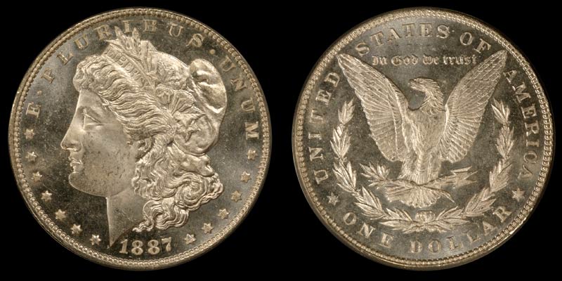 Both sides dazzle with mirrors that are a full 8″ deep, clear, and have powerful reflectivity. Just a few scattered lines and ticks are visible. Keep in mind, 1887 comes more like a silvery DMPL-not like a cameoed 80S. Miss Liberty and the details are frosted a creamy white and have sharp strikes. You can see a faint roller mark on her cheek. The eye appeal is quite flashy.