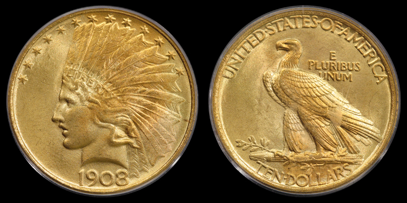 $10 1908 NO MOTTO PCGS MS66
