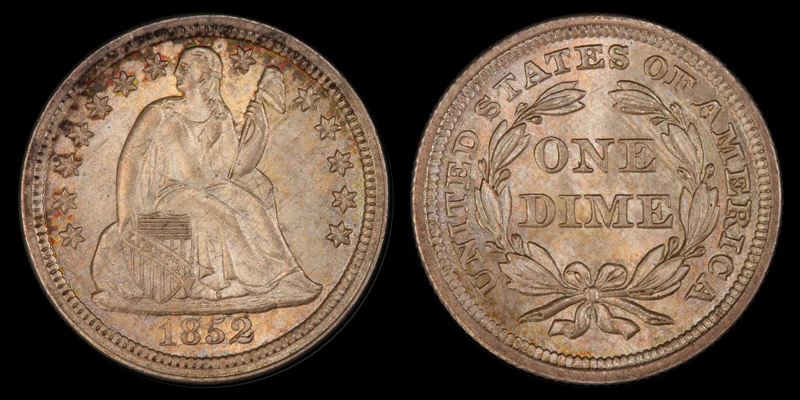 Superb surfaces are exceedingly clean and satiny smooth. Even if you use a strong glass, you will not be disappointed. For an 1852 the luster is good. This coin unquestionably has never been dipped or messed with. A moderate mix of pale golden brown/champagne/lilac colors swirls all over. Miss Liberty and the details are gently frosted and have crisp full strikes. The eye appeal is fantastic!