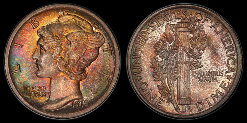 10C 1916 MERCURY PCGS MS67+FB COL GREEN/NEWMAN