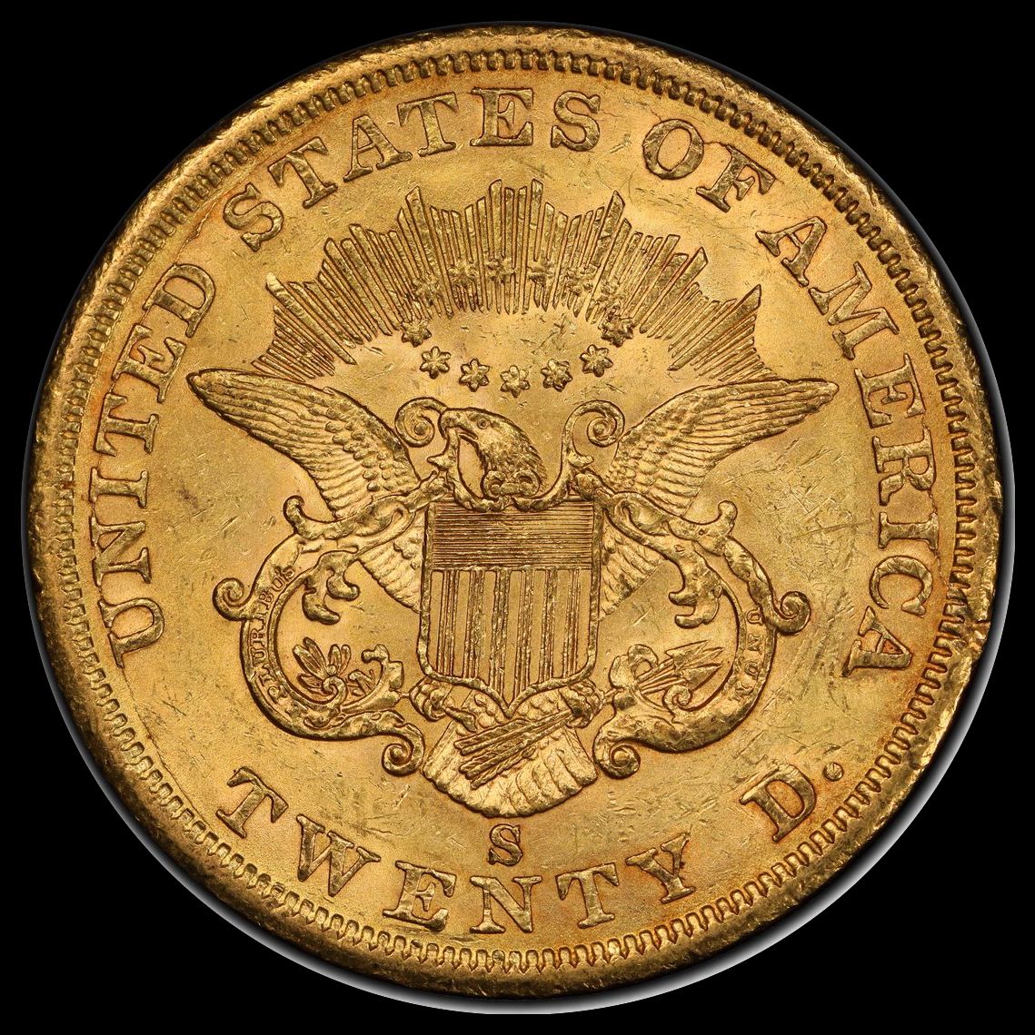 After producing 19,250 double eagles in early 1861 using the famed Paquet Reverse, the San Francisco Mint went on to strike an additional 768,000 examples using the pre-existing “regular” Longacre reverse. Most of these coins entered circulation in the West and were eagerly accepted, leaving most survivors in heavily worn condition for today’s collectors. Recovered treasure ship finds have yielded the majority of the estimated 40 to 55 Mint State survivors, most of which have already been snatched up by collectors and are solidly off the market as part of tightly held collections. For the particularly advanced numismatist, this offering from the Fairmont Collection provides an opportunity to acquire an exceedingly rare Mint State 1861-S that is not a shipwreck find. It is an outstanding coin that is sure to sell for a very strong premium.