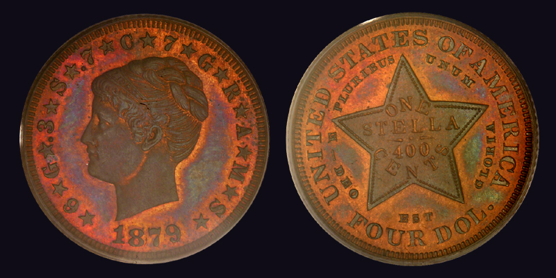 Struck in Copper. Looks RB. Lets start with the FACT that ANY GOLD Coiled Hair Stella in PR65 is worth at LEAST $550,000.00. Here you have one of only four that have been graded by the services (in ANY color). This is also an R-7 (which is 7-12 known). The regular mintage of the Gold pieces is only 20 made. Seems way too cheap at the price we are asking. Also, the coin itself is tremendous. Strong mirrors are clean and have surprising reflectivity. There are no spots. Both sides are a mix of original mint red/violet/purple/blue colors. Miss Liberty and the details are incredibly struck. The eye appeal is the same as the quality-sensational! We can not stress how rare and under valued this piece is. The chances of you seeing another-in any grade offered is slim. PCGS 1, NGC 0.