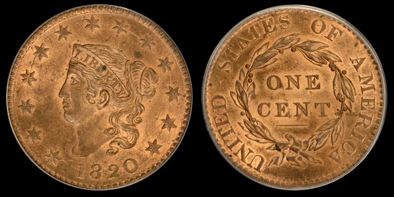 1C 1820 PCGS MS65RB LARGE DATE N-13
