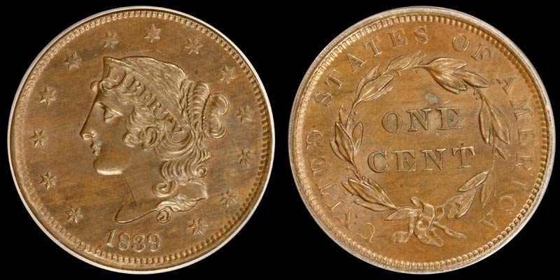 1C 1839 BOOBY HEAD PCGS MS66BN N-6 NAFTZGER
