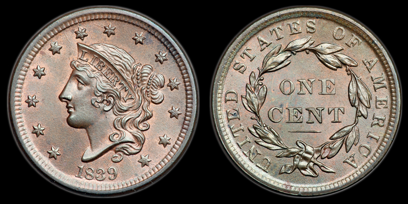 1C 1839 PCGS MS66BN SILLY HEAD N-9