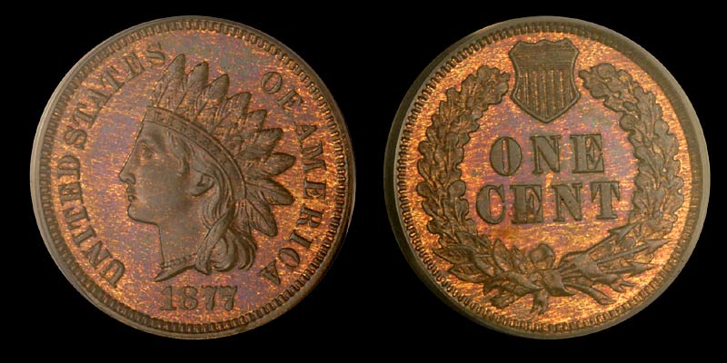 Thats a pretty tough statement, but the coin does indeed back it up. Even using a super strong glass, you will find not one teenie flack or problem. The colors are a rich copper/gold/purple/brown that are enlivened by deep and flashy mirrors. All of the details are needle sharp in strike and boldly stand out. This is NOT your average 1877! PCGS 5, NGC 14. Only NGC has graded one coin finer.