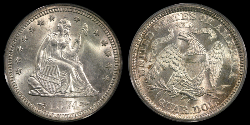 25C 1874S W/A PCGS MS66