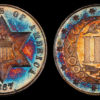 We see no reason why this coin is not a PR65+ at the very least (that’s no guarantee). The mirrors are deep, have outstanding clarity, are clean, and have incredible reflectivity for a coin of this size. They look like freshly made sheet of glass. A wild thick ring of electric royal blue/tangerine/gold opens into small white centers. Every detail is razor sharp in strike and is thickly frosted. Even though its a smaller coin, your eyes will pop out and be bigger when they see it! It IS that WILD! ONLY 625 minted.