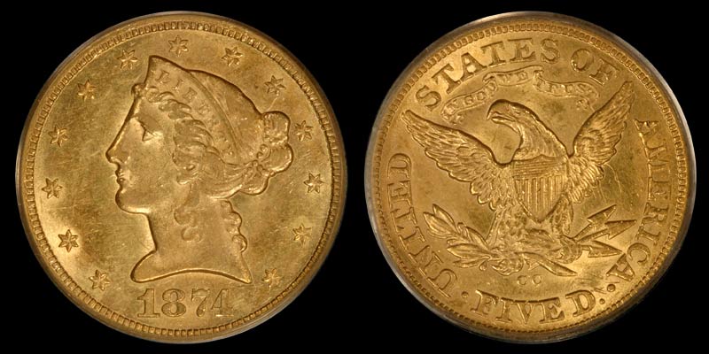 Only 21,198 were minted. PCGS 8, NGC 17. To date, PCGS has graded possibly 2 coins higher (both MS62’s) while NGC has a sole MS61. The last $5 1874CC to sell at public auction brought $22,425.00 06/08 B+M. in 2007 another one sold for $26,450.00 Stacks 10/07 (neither of those figures were for this coin). We feel strongly the owner of the Pickering Creek Collection of CC’s priced this coin more than fair!