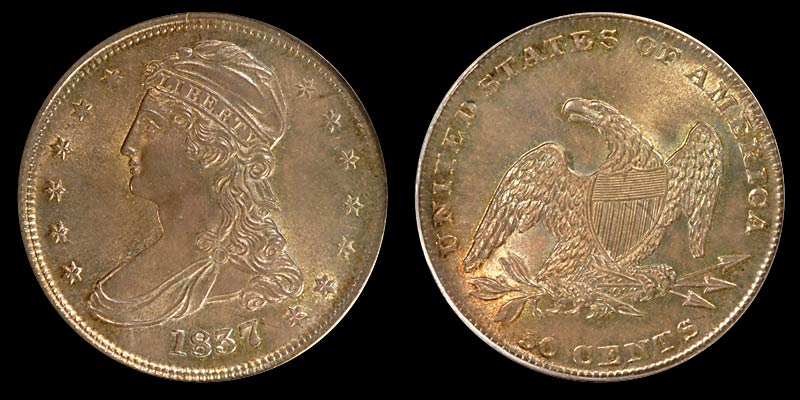 We try to buy EVERY nice RE Half we see in 64 and higher. We bought this piece from a collector at FUN. We loved it because it has remarkably clean and smooth surfaces. Even with a glass there are ZERO imperfections. A strong luster highlights a rich(but NOT dark) color mix of pale purple/pale blue/gold/olive colors. Miss Liberty and the details are fully struck. We think just a well HIDDEN tick on the cheek is all that keeps this coin from an MS65 designation and being worth $13,000.00++. You’ll like the eye appeal too. PCGS 65,NGC 82.