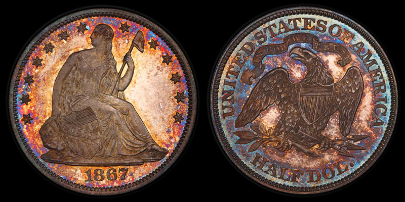 Fantastic deep, crystal clear, clean, and boldly reflective mirrors cover both sides. Even using a strong glass you can not find any imperfections. A moderate mix of ORIGINAL golden brown/violet/blue/purple swirl all over. Miss Liberty and the details are frosted and have full strikes. The eye appeal is terrific!