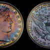 Exceptional deep mirrors are visible from all over. They are remarkably clear, clean, and have very bold reflectivity. They are so clean and smooth they look like a freshly formed sheet of ice. The obverse has killer eye popping original colors of electric purple/deep magenta/green/gold/fiery violet that form a circle. The reverse has deeper colors of pale navy/purple/forest green (it probably laid on felt). We think the deeper colored reverse is the only reason why this coin is not a PR68. Note: the reverse is NOT dull or black. Miss Liberty and the details are frosty and have sharp strikes. The eye appeal is tremendous!