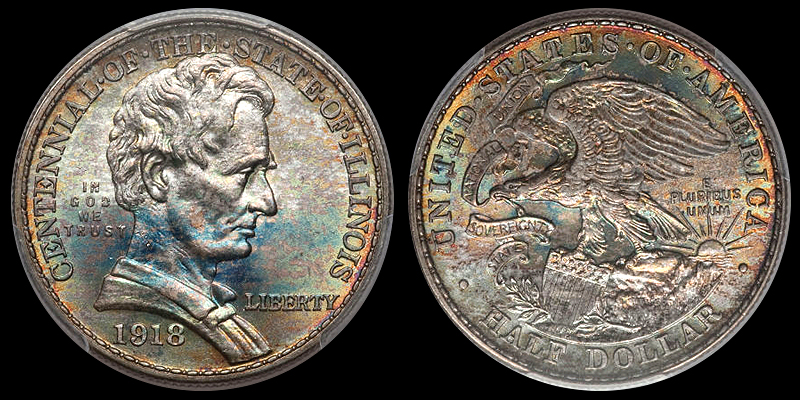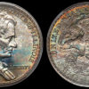 Virtually perfect surfaces are spread all over. You can use a strong glass and look for days and you won’t find any significant problems. A full booming luster shows off some of Mother natures best mixing color talent. various shades of blue/green/gold/pale purple/violet all swirl around both sides. Lincoln and all of the details are sharply struck and have light frost. This Lincoln Commem is total eye candy!