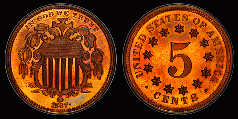 J- 573 1867 5C PCGS PR65RD CAMEO EX SIMPSON